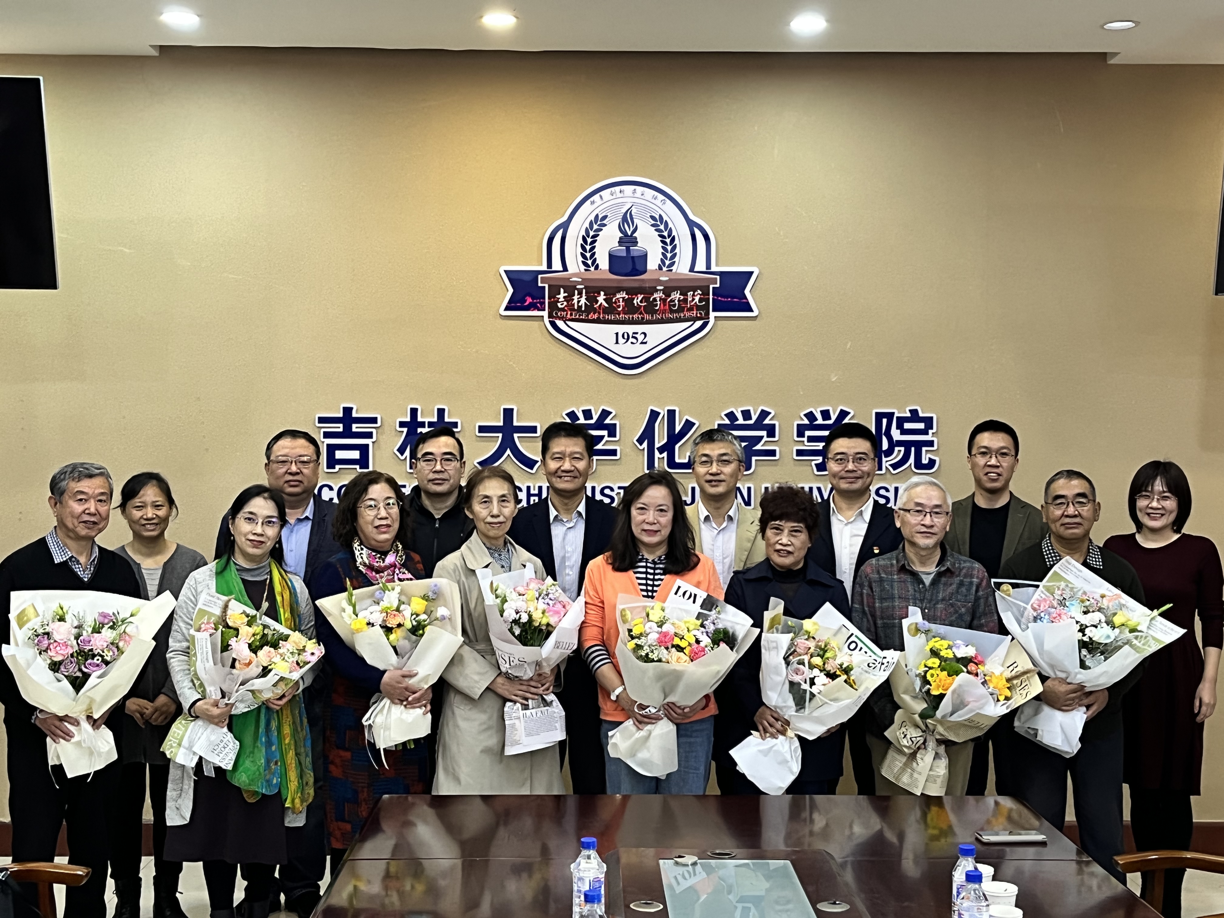 荣休纪念牌和鲜花,并合影留念。