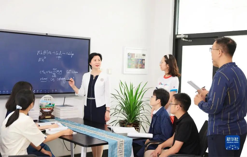 于吉红(中)与学生在一起讨论(2022年8月16日摄)。新华社发