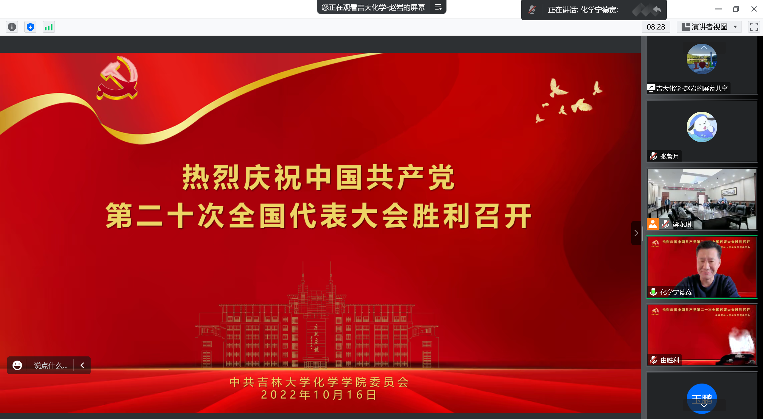 未来相当长一段时间的理论学习重点。各支部应认真组织全院师生党员深入学习,将理论学习与教学科研工作紧密结合,以党的二十大精神为指引,勤奋学习、踏实工作、勇于创新、立德树人,为化学一流学科建设作出更大的贡献。