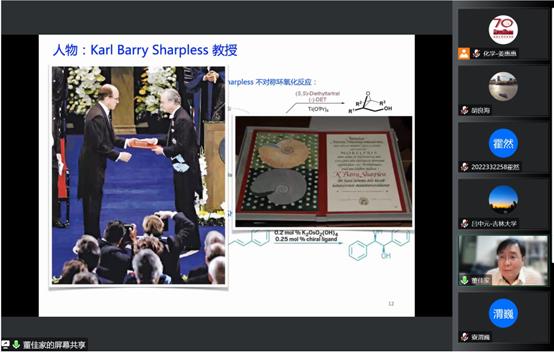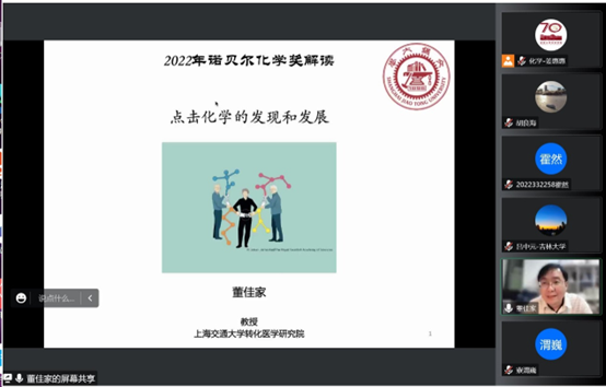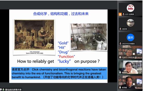 讲座中,董佳家教授围绕点击化学的发现和发展,深入浅出且幽默诙谐地介绍了 “点击化学”——模块化连接砌块分子,实现分子功能的理论本质,并对其开创了功能导向的化学时代进行了详细解读。同时分享了K. Barry Sharpless教授乐于学习、善于发现、勇于探索的科学精神以及Sharpless教授生活工作中的一些有趣的小故事。随后,董佳家教授激励广大学子,希望当代青年学者能够学习发扬老一辈化学家的科学精神,内化于心,外化于行,勇攀学术高峰。在交流互动环节,董佳家教授耐心详细地解答了院内外师生的问题,并对点击化学领域的发展做出了展望,博彩App