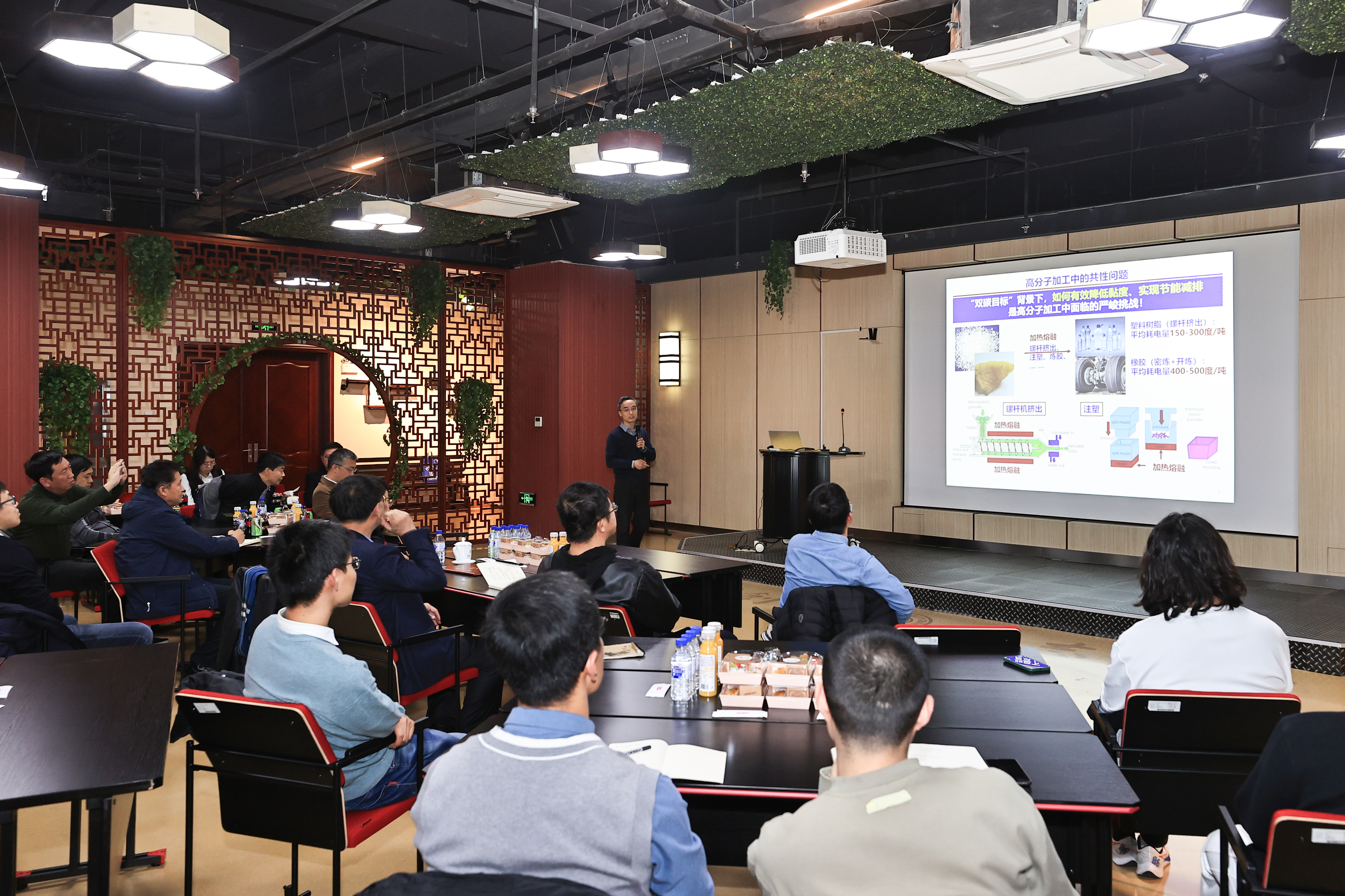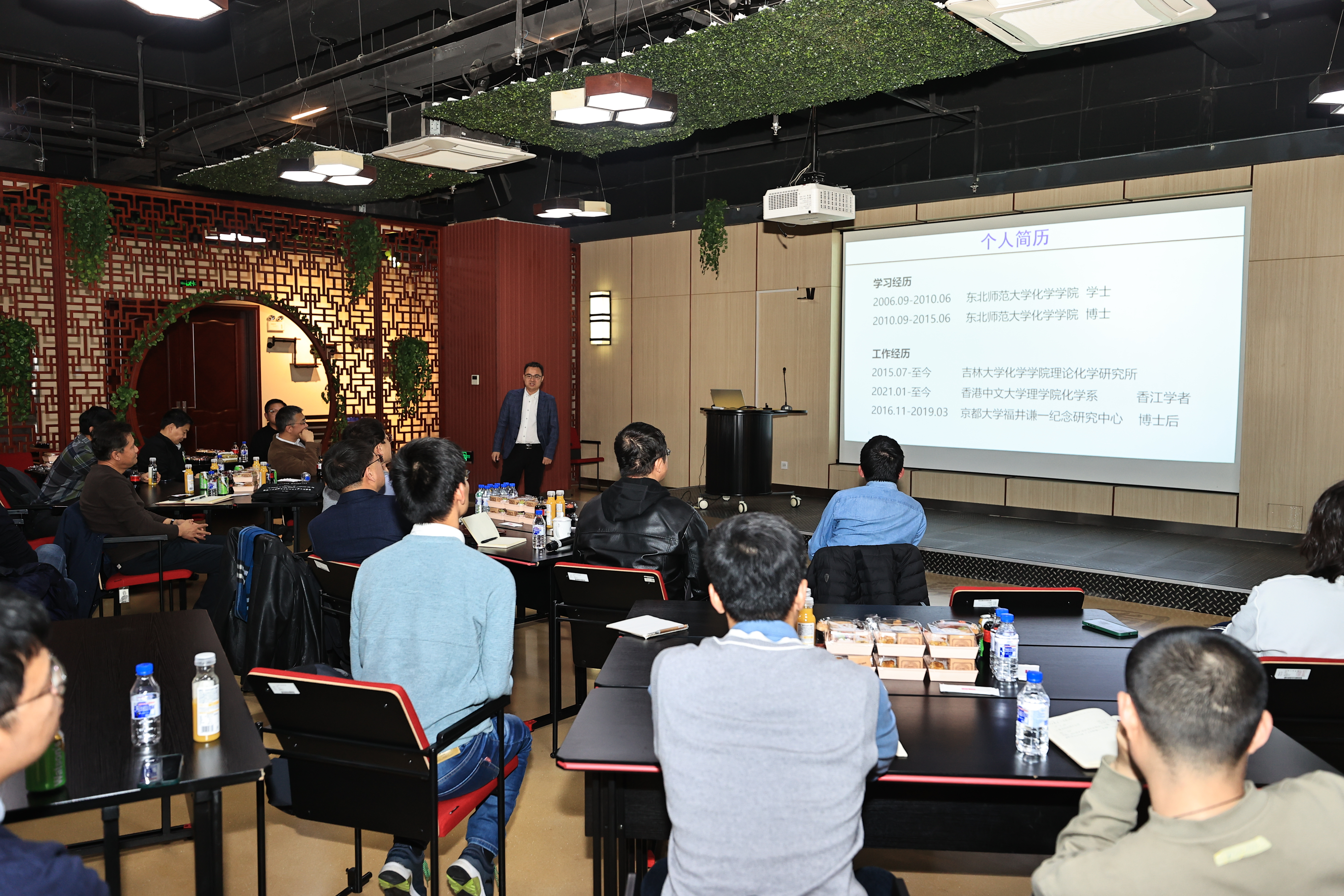 的两位青年学者钱虎军和钟荣林分别围绕“全高分子纳米复合机制”和“化学反应的熵校正与催化剂精准设计”介绍自己的工作与思考。张希、徐昕与青年学者们一道分享创新思路,并就相关领域的学术前沿、发展动态等交流研讨。