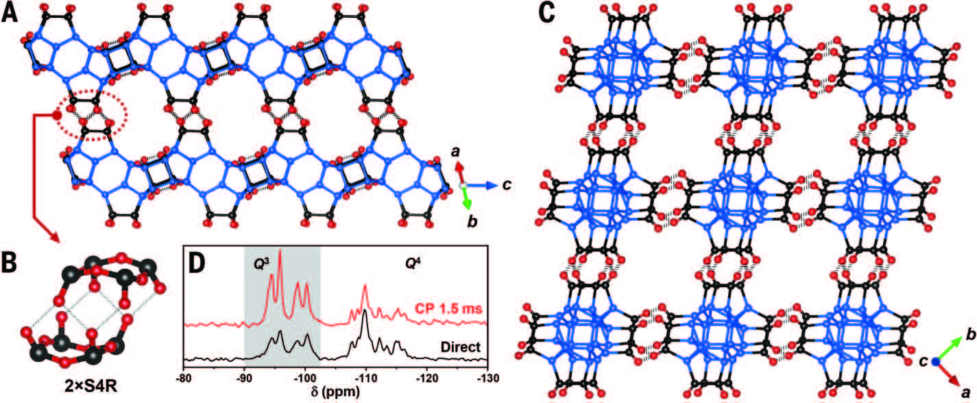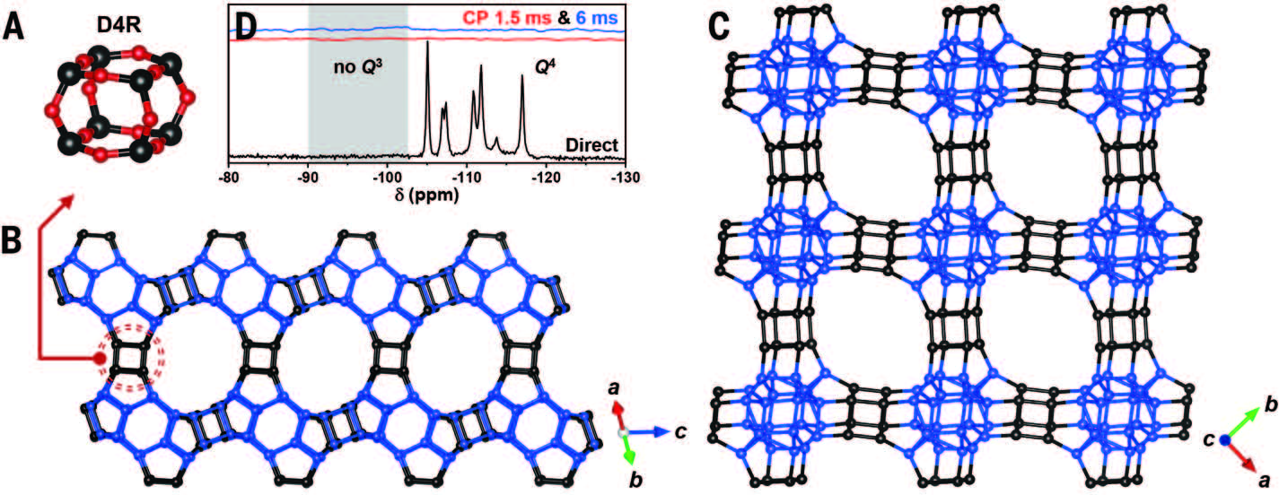 图3. ZEO-3的结构:(A)D4R单元;(B)沿[110]和[1-10]方向的14MR孔道;(C)沿[001]方向的16MR孔道;(D)29Si固体核磁谱(来源:Science)