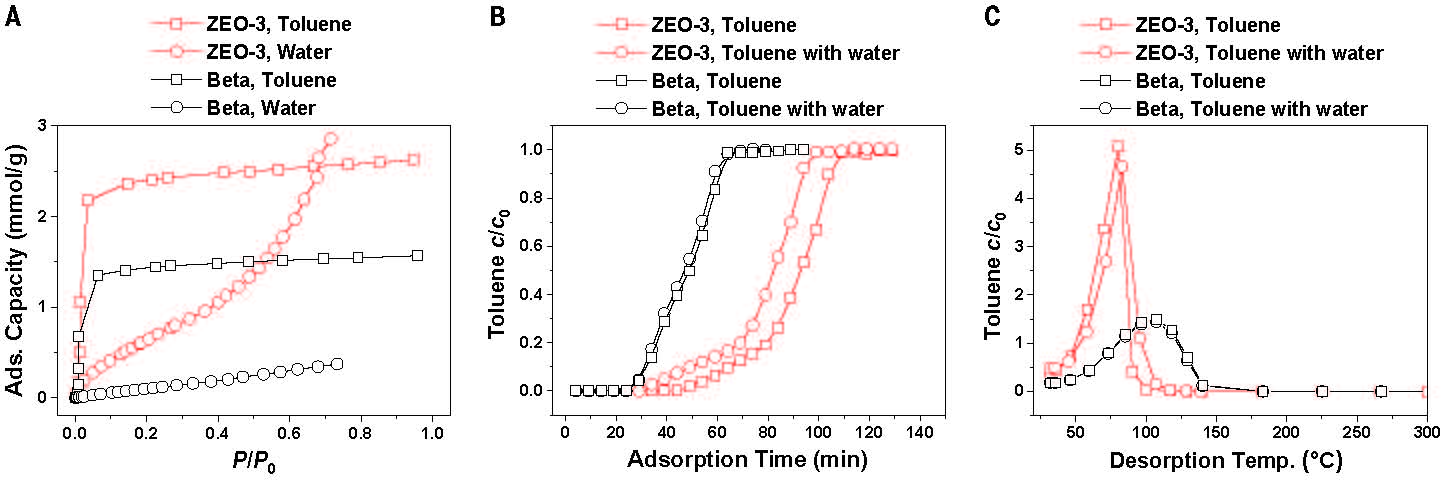 图5. ZEO-3处理VOCs的性能:(A)静态吸附;(B)动态吸附;(C)脱附曲线(来源:Science)