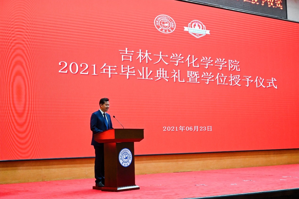 这片热土,同学们不仅夯实了基础知识,更重要的是培养起了独立思考、百折不挠的科学精神。未来,同学们会面临各种各样的机会、挑战、挫折、诱惑,但吉大化学赋予他们的责任感会指引着同学们,做一个有格局、有担当的人,站在国家和时代的高度,选择有意义的事业。