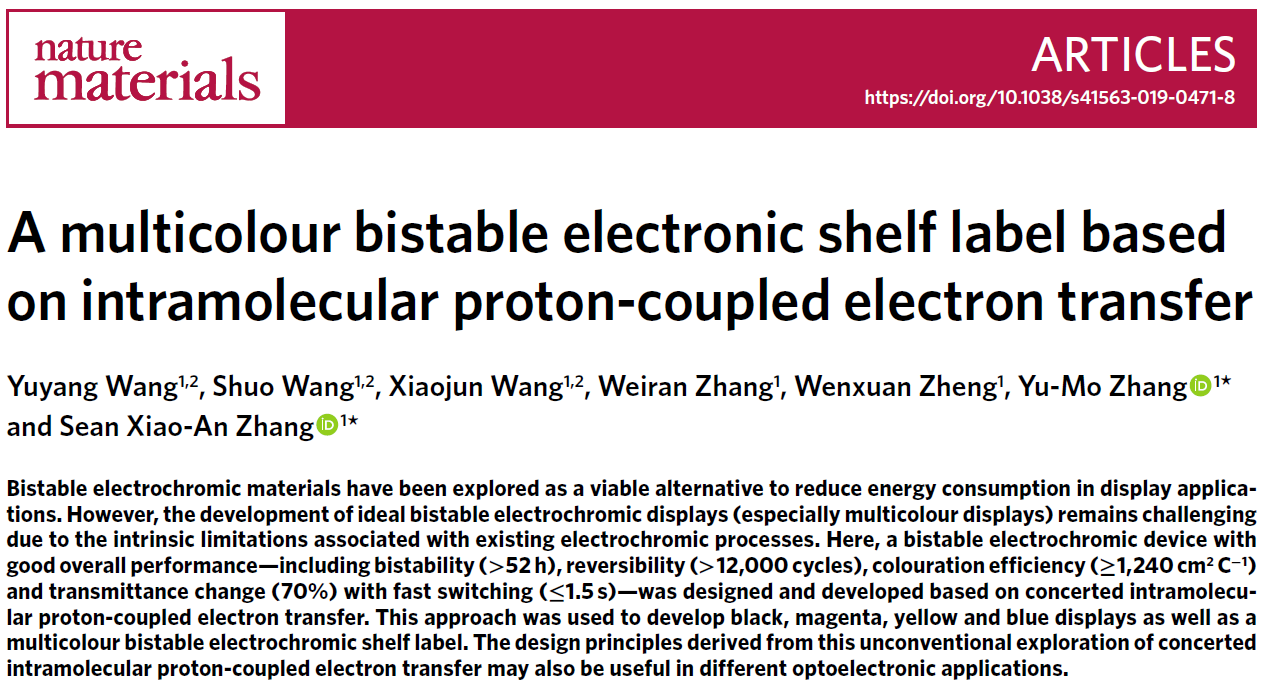之后,科研团队进一步设计并开发出全新的高分子电致变色材料,较之前的对比度、稳定性、双稳态等性能方面都有新进展、新突破,更具产业化前景,并展示了该类多色双稳态电致变色器件在商店货架的电子标签(ESL)(或电子广告屏)上的潜在应用,其科研成果于2019年9月在《自然-材料》上发表。