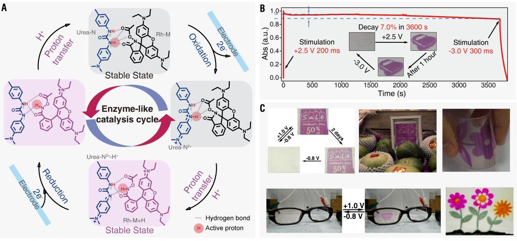 这一超级省电显示技术的独到之处在于,其模仿了生命体系中质子和电子相互作用和维持分子动态稳定的超分子工作原理,巧妙地设计了电诱发分子酸碱性的可逆变化,并以此来实现功能染料的颜色变化和持续稳定性。