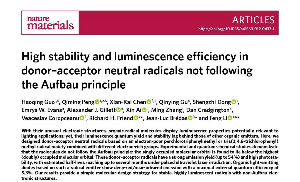 Jean-Luc Brédas教授团队和剑桥大学卡文迪许实验室Richard H. Friend教授团队的合作研究论文“不遵循构造原理的高稳定高发光效率给受体结构中性自由基”(High stability and luminescence efficiency in donor–acceptor neutral radicals not following the Aufbau principle, Nature Materials, 2019, DOI:10.1038/s41563-019-0433-1),博彩App