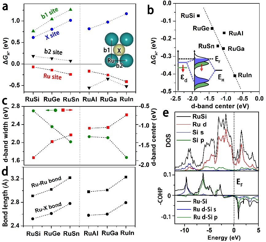 2. 揭示了金属间化合物RuSi的Ru顶位位点具有类Pt催化性质的内在原因:应力效应和配体效应的平衡赋予了催化剂合适的Ru d带电子结构。结合一系列金属间化合物RuX (X = Si, Ge, Sn, Al, Ga和In)的理论研究发现,引入间隙原子X形成金属间化合物RuX,会调控Ru的d带电子结构(d带中心、d带宽度),改变Ru顶位位点的ΔGH*值。理论计算结果表明,Ru顶位位点的ΔGH*值和Ru d带中心线性相关,其中RuSi的顶位位点维持最弱的氢吸附能力。Ru d带中心变化受应力效应(Ru-Ru键长变化)和配体效应(Ru和X的电子杂化作用)两个因素决定。和其他RuX(X = Ge, Sn, Al, Ga和In)相比,RuSi具有更弱的拉伸应力效应和更强的配体效应,因此d带展宽,d带中心下移,有利于实现更弱的氢吸附能力。