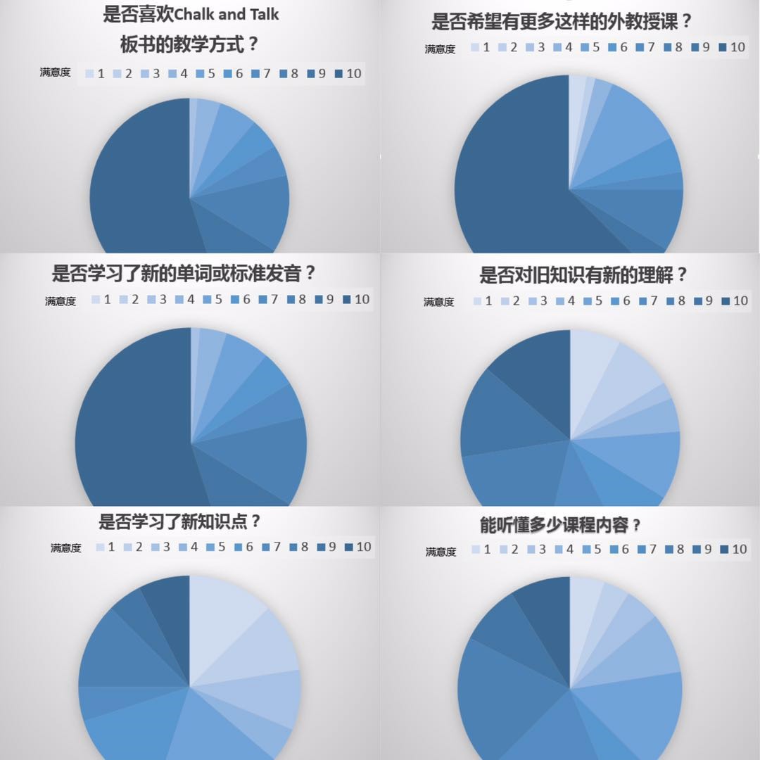 通过对学生课堂效果的问卷调查,结果显示有80名同学积极参与评价,反馈结果如下,其中80%的同学对板书式的教学方式表示非常满意(>8分);在专业英语和化学知识的吸收理解方面,也有一半以上的同学表示在这种全英授课的条件下,能够将专业知识和英语同步提高(>6分);并有70%以上的同学强烈希望(>8分)以后有更多这样的外教授课。