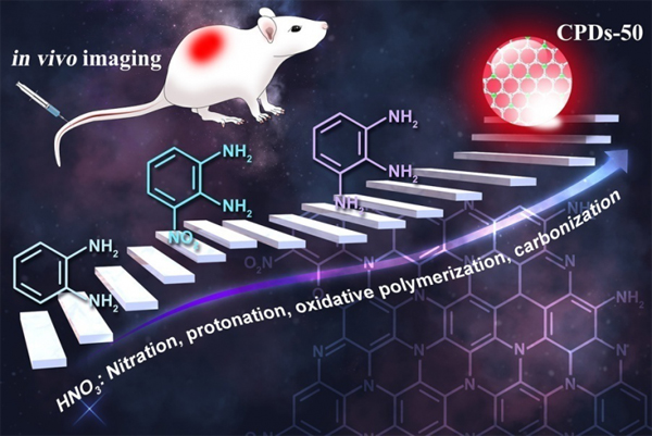 碳化聚合物点 (Carbonized Polymer Dots, CPDs),通常是指分子前躯体在水热环境中发生聚合反应而生成二聚体,低聚物及聚合物等中间体,且随着反应的进行,这些中间体进一步聚合、脱水、碳化而形成的具有聚合物结构或聚合物/碳杂化结构的新型碳纳米材料,也是继富勒烯、碳纳米管、石墨烯之后最受关注的明星碳纳米材料之一。它具有优异的光稳定性、较高的荧光量子效率、良好的生物相容性、较低的毒性等一系列优点,在生物医学、环境能源和催化等领域有着重要的研究应用前景。蓝绿光的碳化聚合物点已被广泛报道,但如何通过简单的方法制备生物相容性好、量子效率高的红光或近红外光发射的碳化聚合物点仍是目前困扰研究者们的难点之一。