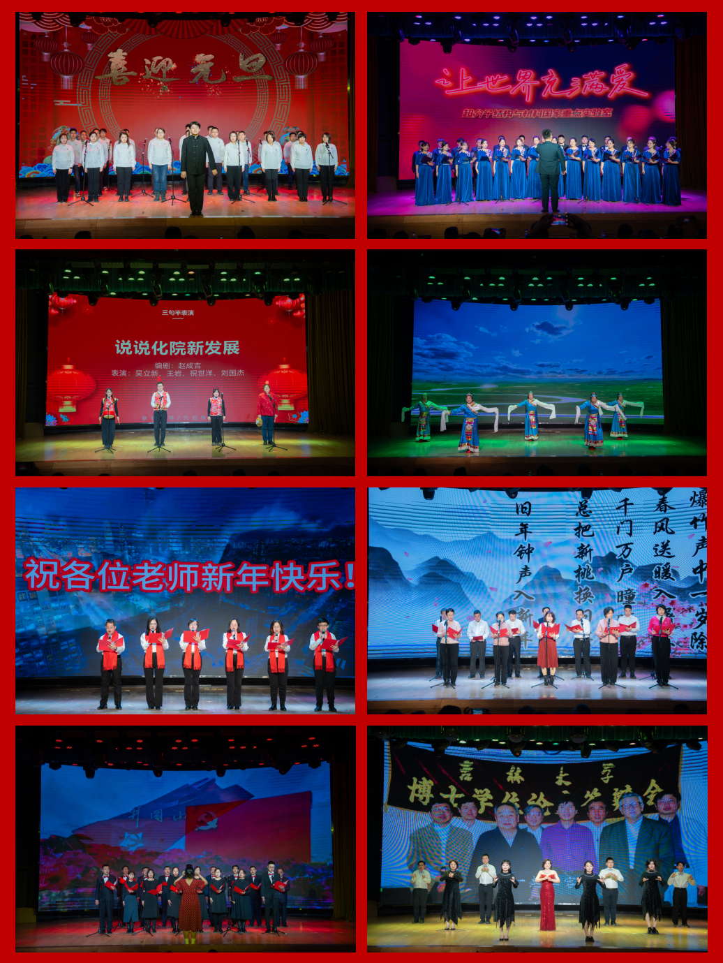 教师对吉大化学的热爱与新年的期望;特种工程塑料教育部工程研究中心表演的《一路同行》《千手观音》展现家国情怀,彰显师生才艺;化工与应用化学系合唱《没有共产党就没有新中国》,表达对党的感恩与对祖国的热爱;公共教学中心舞蹈《画你》,为大家呈现了一场视觉盛宴;博彩App