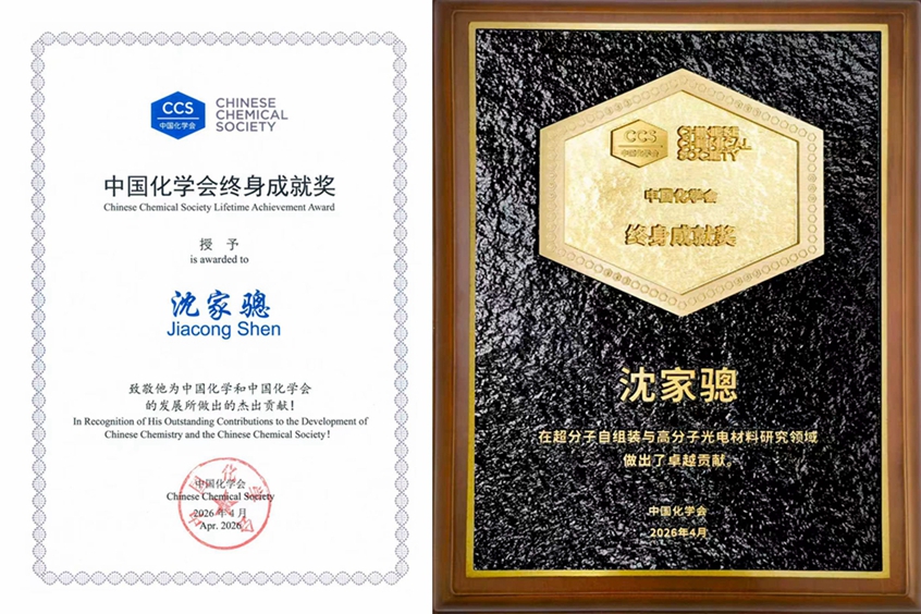 沈家骢教授因在超分子自组装与高分子光电材料研究领域做出了卓越贡献,获颁第五届中国化学会终身成就奖。