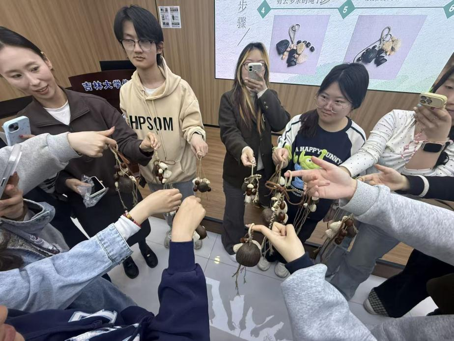 活动伊始,主持人引导大家闭眼静心,伴随三次深长呼吸,同学们暂别喧嚣与疲惫,完成心灵的初步放松。制作环节中,主持人介绍了果壳风铃的起源与音疗价值,其空灵音色能舒缓神经。同学们聆听不同果壳的声响,反复搭配构思,在穿线、打结、固定中梳理心绪。风铃制成后,清脆铃声交织回荡。分享环节,同学们坦诚交流感悟,有人从果壳声响中感知自然气息,有人在穿线中读懂情绪需耐心安放。