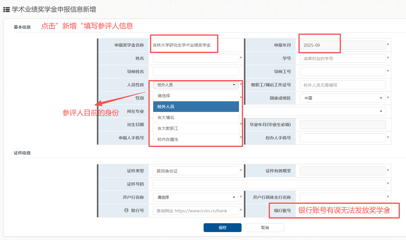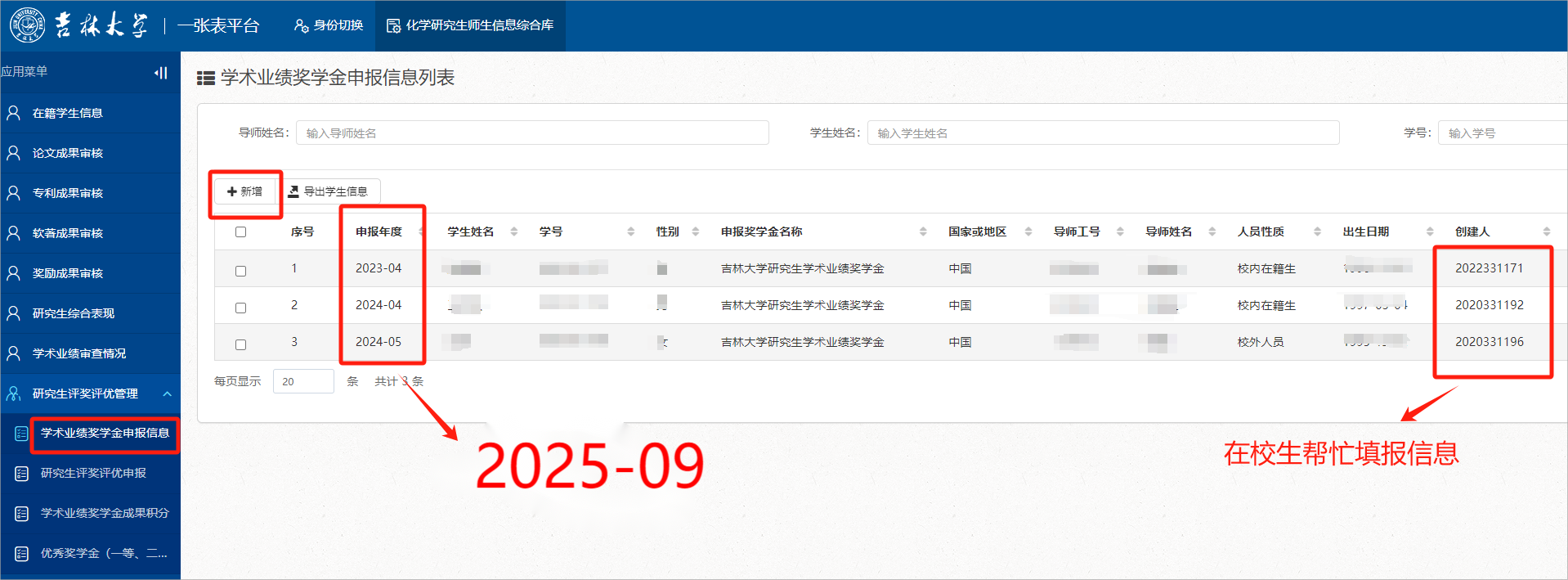 1. 使用个人邮箱账号登录“一张表”平台(//one.slot-app.net),在“研究生评奖评优管理”- “学术业绩奖学金申报信息”栏点【新增】进行申报人及银行卡信息填报。请申报人务必认真填写和核实银行卡等相关信息,确保准确无误,保证获奖者奖学金及时发放。已毕业研究生可由在校生帮忙代填。