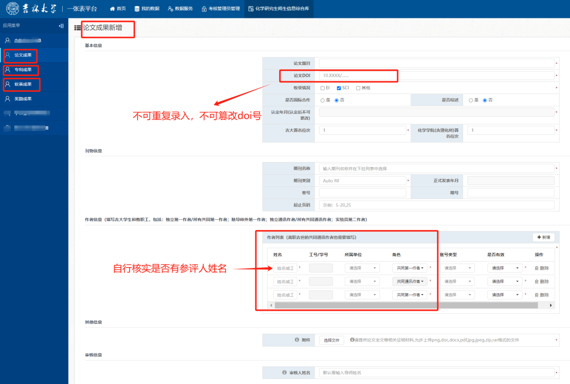 2.使用吉大校内邮箱账号登录“一张表”平台(//one.slot-app.net)录入相关的论文、专利、软著、奖励类成果,提交后由导师进行审核。录入“论文DOI”时,若提示“数据不可重复”,说明该成果已在数据库中,不可重复填写,可通过查询方式确认参评成果信息的完整性和准确性;提交成果时,存在省略其他共同第一或共同通讯作者、篡改作者排序、篡改论文DOI号重复录入成果等误导评审行为的,取消评奖评优资格;