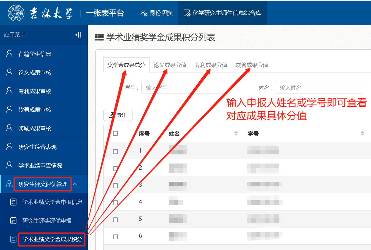 如对初评获奖候选人成果有异议,请先登录“博彩App 一张表平台”中的“化学研究生师生信息综合库”(//one.slot-app.net/),在【研究生评奖评优管理】-【学术业绩奖学金成果积分】栏进行具体查询(见下图说明)。