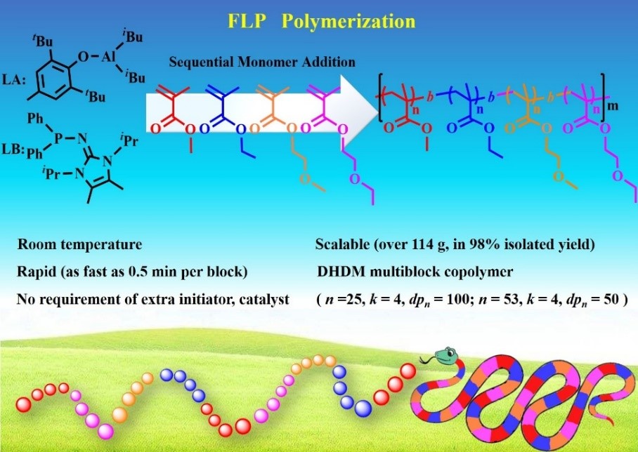 张越涛教授课题组一直致力于FLP催化高分子活性聚合的研究,并取得一系列开创性成果。最近,他们利用FLP活性聚合体系快速且大量地聚合甲基丙烯酸甲酯(MMA)等四种亲疏水性不同的单体,实现DHDM(double high (molecular weight anddpnvalue) and double multiple (monomers and block numbers))序列可控高分子的合成。得到了世界纪录级的53嵌段序列可控高分子(图),该记录比之前的提高了大约2.5倍。不仅如此,每一嵌段的dpn也由原来的10增加到50。真正的做到了双高和双多(DHDM)。该聚合体系简单易行,在室温下烧瓶中即可完成,除了在反应开始时需要加入催化体系外,其它的嵌段只需连续加入不同单体即可。体系不仅可以高产率的(>98%)实现百克级的放大实验,而且聚合速度也非常快。整个53段聚合只需要不到30分钟就可以合成得到一系列分子量可控且分子量分布较窄的序列可控高分子。上述特征展现了该体系具有非常好的工业化应用前景。