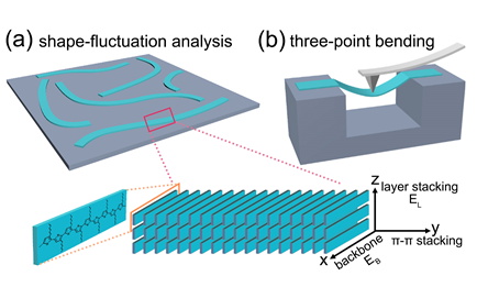 该研究组最近将纳米力学研究拓展到结晶性共轭高分子体系,采用AFM形状分析及三点弯曲方法研究了聚(3-己基噻吩)(P3HT)纳米纤维的力学性质(如下图所示),发现沿着层堆叠方向及高分子主链方向杨氏模量的巨大差异(前者比后者高1-2个数量级)(ACS Macro Lett.2020,9, 108)。