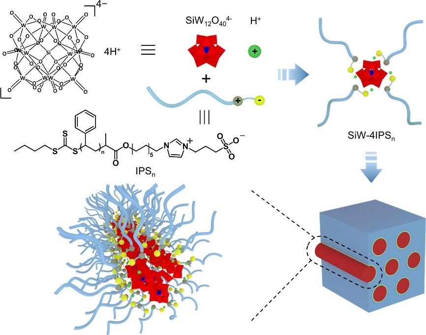 李昊龙课题组长期从事无机团簇/聚合物杂化材料的结构与功能研究,致力于通过团簇杂化去调控聚合物的微相结构,实现聚合物材料力学和电学功能的协同增强,在团簇/聚合物共组装方法、团簇/聚合物杂化电解质等方面取得了系列进展:(1)提出了基于团簇自组装的聚合物力学改性新策略,设计了配体可移动的无机团簇,可作为自组装型填料在聚合物基体中形成多级结构,实现了显著的力学增强(ACS Nano 2019, 13, 7135-7145.);(2)提出了基于团簇静电交联调控聚合物微相结构的新策略,普适于嵌段共聚物和梳型共聚物,可通过一步静电交联制备双连续结构的聚合物杂化材料,在材料中同时实现了高离子电导率和高力学强度(Angew. Chem. Int. Ed. 2017, 56, 9013-9017;CCS Chemistry 2021, 3, 603-613.)。