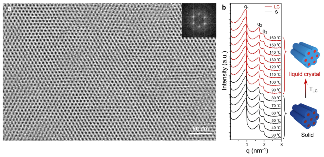 近期,该课题组报道了一种基于多金属氧簇和两性离子聚合物自组装的高温稳定型液晶电解质(图一)。聚合物配体可以在多金属氧簇表面发生动态重排,形成亚10纳米且高度有序的六方柱状相,其柱芯由多金属氧簇堆积而成(图二a)。在该结构中,多金属氧簇同时发挥了静电交联剂和高质子导体的作用,一方面增强了柱状相的结构稳定性,另一方面赋予了柱状相优异的质子传导能力,使得该柱状相能够作为高温稳定的质子通道。研究表明,这些柱状通道结构能够在90-160℃的宽温度范围内表现出优异的稳定性,即使在液晶态时,其微相结构仍与固态时保持一致(图二b),表现为高度有序的液体。这种高温稳定性是传统小分子液晶无法实现的。研究者将固态核磁双量子滤波技术和变温红外表征技术相结合,阐明了该体系中可移动质子的来源以及液晶态的质子传导机制。