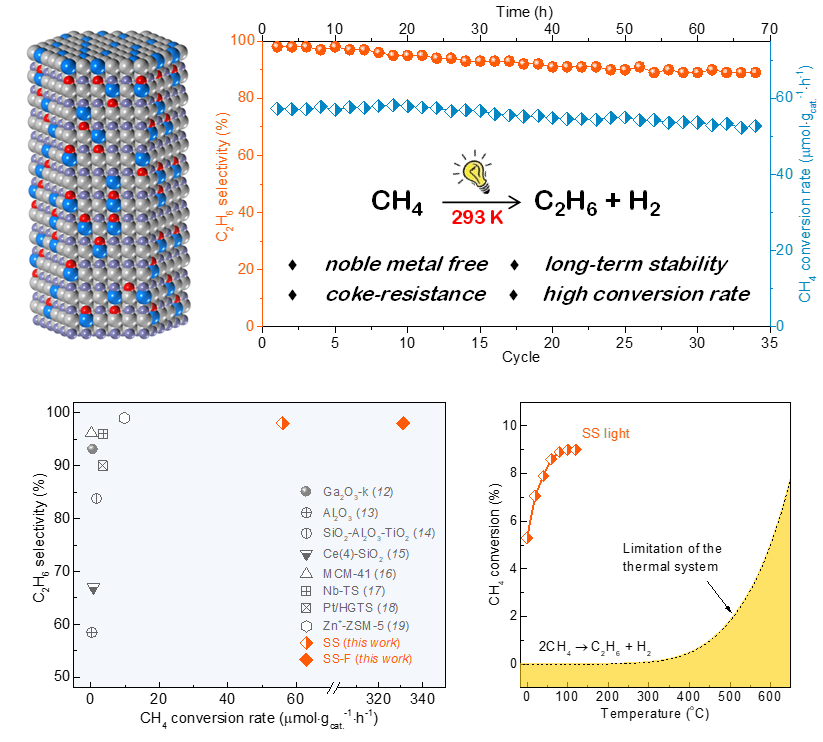 图:半导体氮化物固溶体材料用于高效甲烷室温无氧脱氢偶联,突破光催化剂不稳定易失活的难题,催化反应速率较之前的记录提高了33倍。