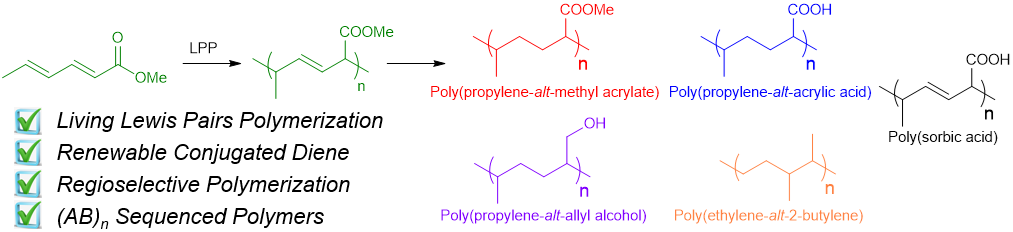 图1:Lewis酸碱对催化山梨酸甲酯的1,4选择性活性聚合合成具有(AB)n交替序列结构的聚合物