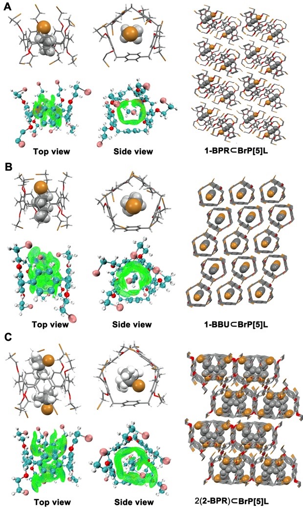 图二:A-C,BrP[5]L分别与1-溴丙烷、1-溴丁烷以及2-溴丙烷的晶态主客体络合结构