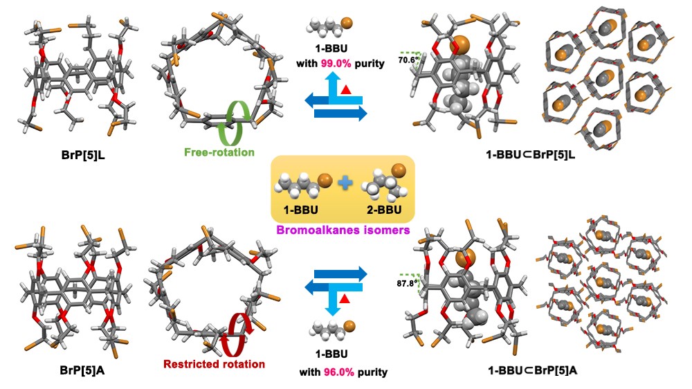 在前期的工作中,该课题组设计合成了一例“骨架精简版的”甲基柱[5]芳烃衍生物,即精巧型甲基柱[5]芳烃(permethylated leggero pillar[5]arene),并进一步在固相条件下实现了对其分子堆积从无序到有序(无定形态至晶态)的精准调控(J. Am. Chem. Soc.2021,143, 20395)。在此研究工作基础之上,该课题组成功设计并合成了一种全溴乙基取代的精巧型柱[5]芳烃衍生物(perbromoethylated leggero pillar[5]arene,简称为BrP[5]L),随后通过客体诱导的方式实现了对其固相分子堆积从无序到有序的精准调控并同时利用该过程实现了对卤代烃位置异构体的高精准式吸附与分离应用(图一)。实验结果表明,无定形且无孔的BrP[5]L粉末可以通过固相主客体相互作用来吸附多种溴代烷烃蒸汽(1-溴丙烷、2-溴丙烷、1-溴丁烷以及2-溴丁烷),进而构筑得到多种溴代烷络合形式的有序超分子组装体。同时,作者发现1-溴代烷和2-溴代烷与BrP[5]L之间所形成的固相主客体络合结构具有不同的键合模式以及热力学稳定性差异,这使得无定形BrP[5]L粉末在1-/2-溴代烷烃位置异构体的吸附分离方面展现出了巨大的应用潜力。