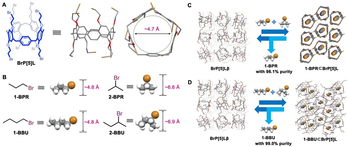 图一:A,B,精巧型柱[5]芳烃衍生物BrP[5]L以及1-溴丙烷、2-溴丙烷、1-溴丁烷以及2-溴丁烷的分子结构;C,D,利用BrP[5]L无定形材料实现卤代烃异构体高选择性吸附分离示意图。