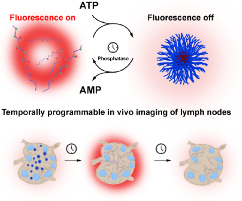 、超分子结构与材料国家重点实验室李云峰课题组开发了一种ATP驱动的具有良好生物相容性的聚合物纳米粒子的非平衡自组装体系,该体系可以实现时间可编程的小鼠淋巴结体内成像。该体系主要包括三个组分,即带正电荷的聚合物、ATP和磷酸酶。通过改变这些成分的浓度,瞬态聚合物纳米粒子的寿命从几分钟调控到几百分钟。通过用ATP为体系补充燃料,可以获得多达 11次聚合物纳米粒子的耗散自组装循环。有意思的是,这种耗散自组装体系可以通过冷冻来暂停,并且在冰箱中储存至少45天后,耗散自组装行为能够恢复。更重要的是,聚合物纳米粒子的耗散体系具有良好的细胞相容性。此外,利用磺基花青染料(Cy5)修饰的聚合物作为构筑单元,聚合物纳米粒子在时间上自我调节荧光强度;其可以对淋巴结进行时间可编程的体内成像。