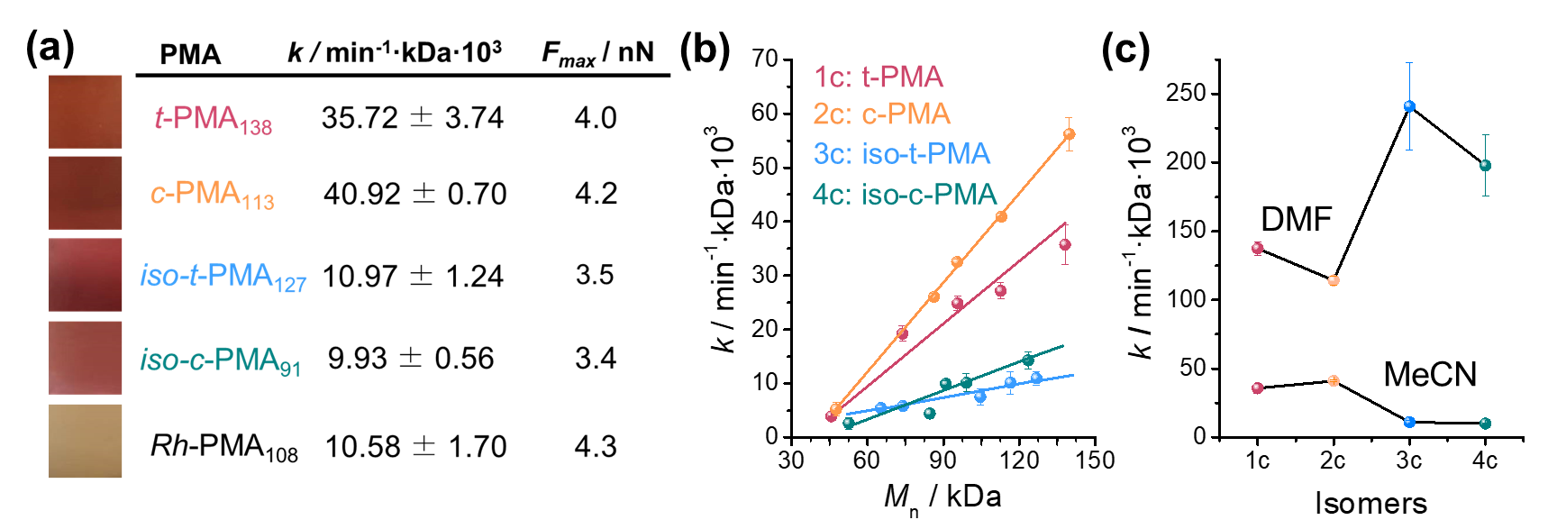 图3.(a)含ABPX和Rh的PMA聚合物超声颜色、超声开环速率常数及理论模拟开环力值;(b)含ABPX的PMA速率常数与分子量之间的关系;(c)开环速率的溶剂依赖特点