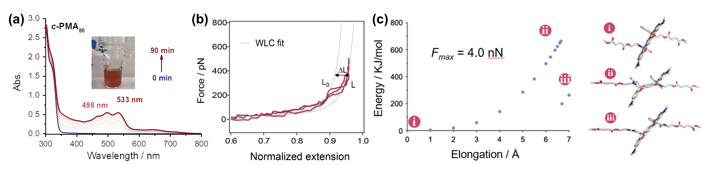 图2.举例:(a)超声实验的紫外-可见吸收光谱及超声后溶液颜色;(b)单分子力谱图;(c)基于COGEF的理论模拟结果