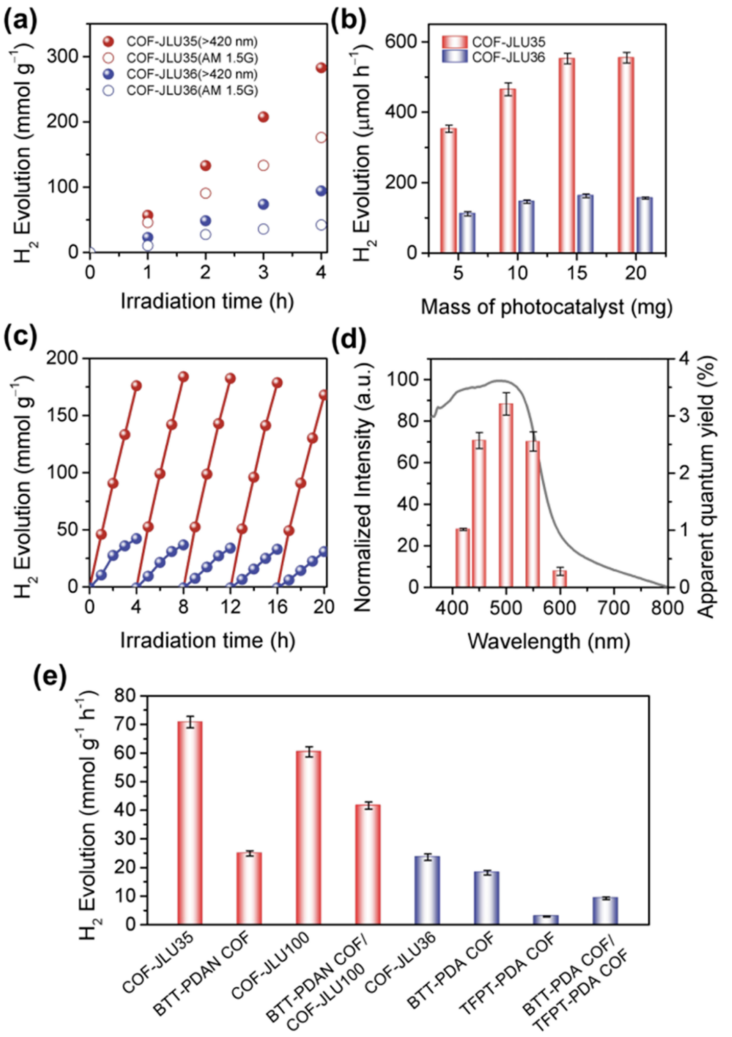 图3:a)在可见光(λ > 420 nm)和AM 1.5G激发下TCDA-COFs的产氢活性;b) TCDA-COFs质量对光催化析氢活性图;c) TCDA-COF循环光催化曲线;d) COF-JLU35不同波长下的AQY;e) TCDA-COFs与两组分COFs对照产氢活性。