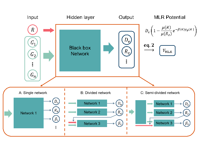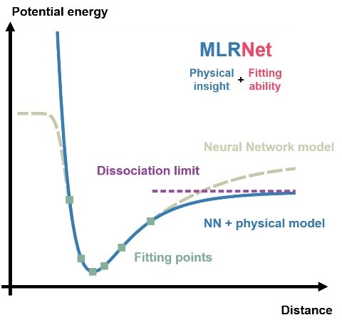 、理论化学研究所李辉教授课题组在《Journal of Chemical Theory and Computation》上发表了题为” MLRNet: Combining the Physics-Motivated Potential Models with Neural Networks for Intermolecular Potential Energy Surface Construction”的研究工作。该工作讨论了一种“物理模型+神经网络”的理论框架,通过将神经网络嵌入物理势能函数的方式,同时结合神经网络和物理模型在势能拟合中的优势。基于该框架,作者提出了一种用于光谱精度分子间相互作用势拟合的神经网络模型,MLRNet模型。该模型突破了传统神经网络模型在相互作用长程和短程渐近区拟合效率低、外推误差大的问题,并展现出很高的拟合精度和高维拟合效率,为未来神经网络势能模型的发展提供了新思路。
