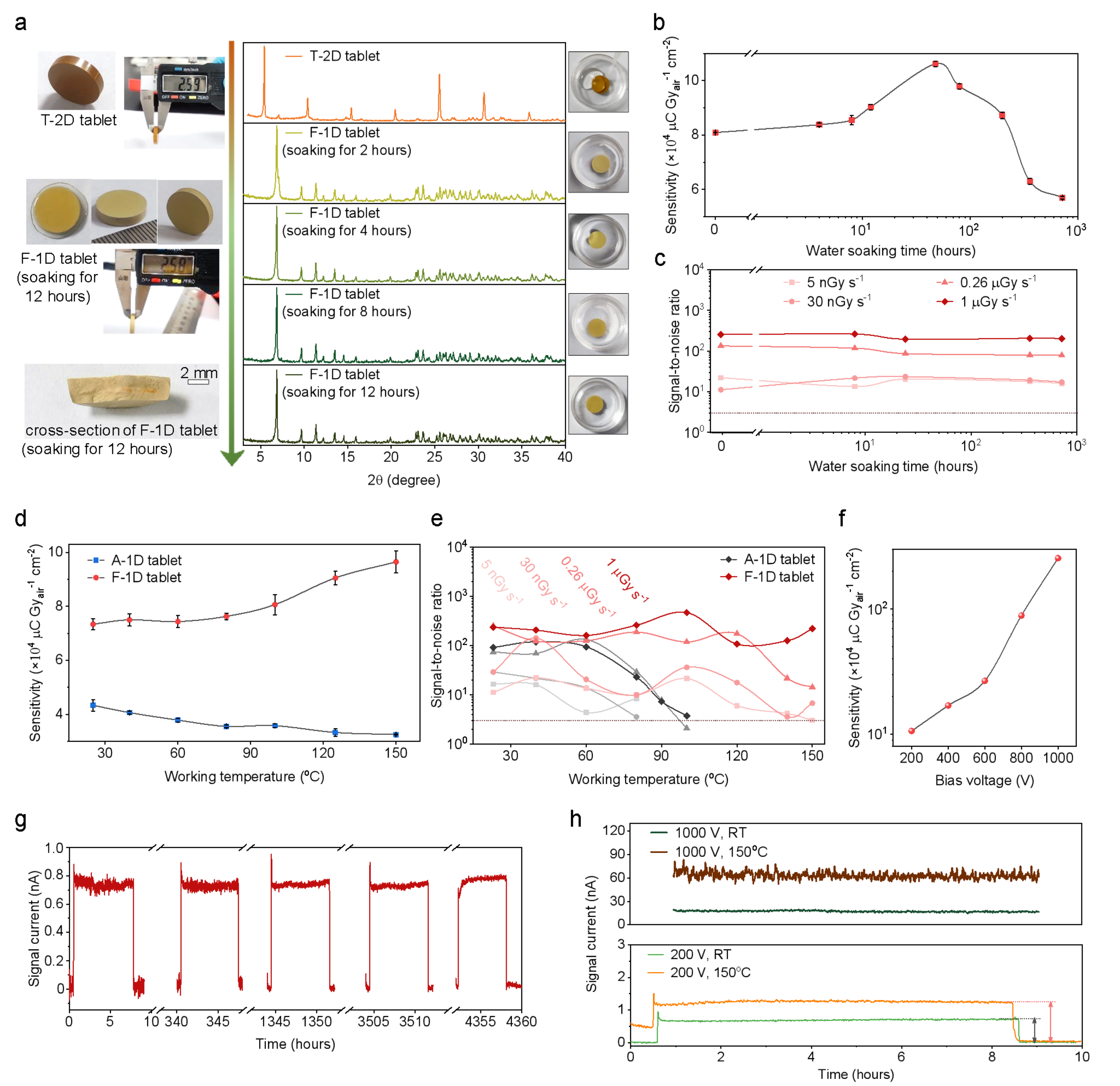 图2.a,XRD监测维度转变及水浸泡稳定。b,c,射线响应灵敏度随水浸泡时间的变化曲线。d,e,射线响应灵敏度随工作温度的变化曲线。f,射线响应灵敏度随偏置电压的变化曲线。g,探测器的长期工作稳定性。h,探测器的耐高温高压测试。