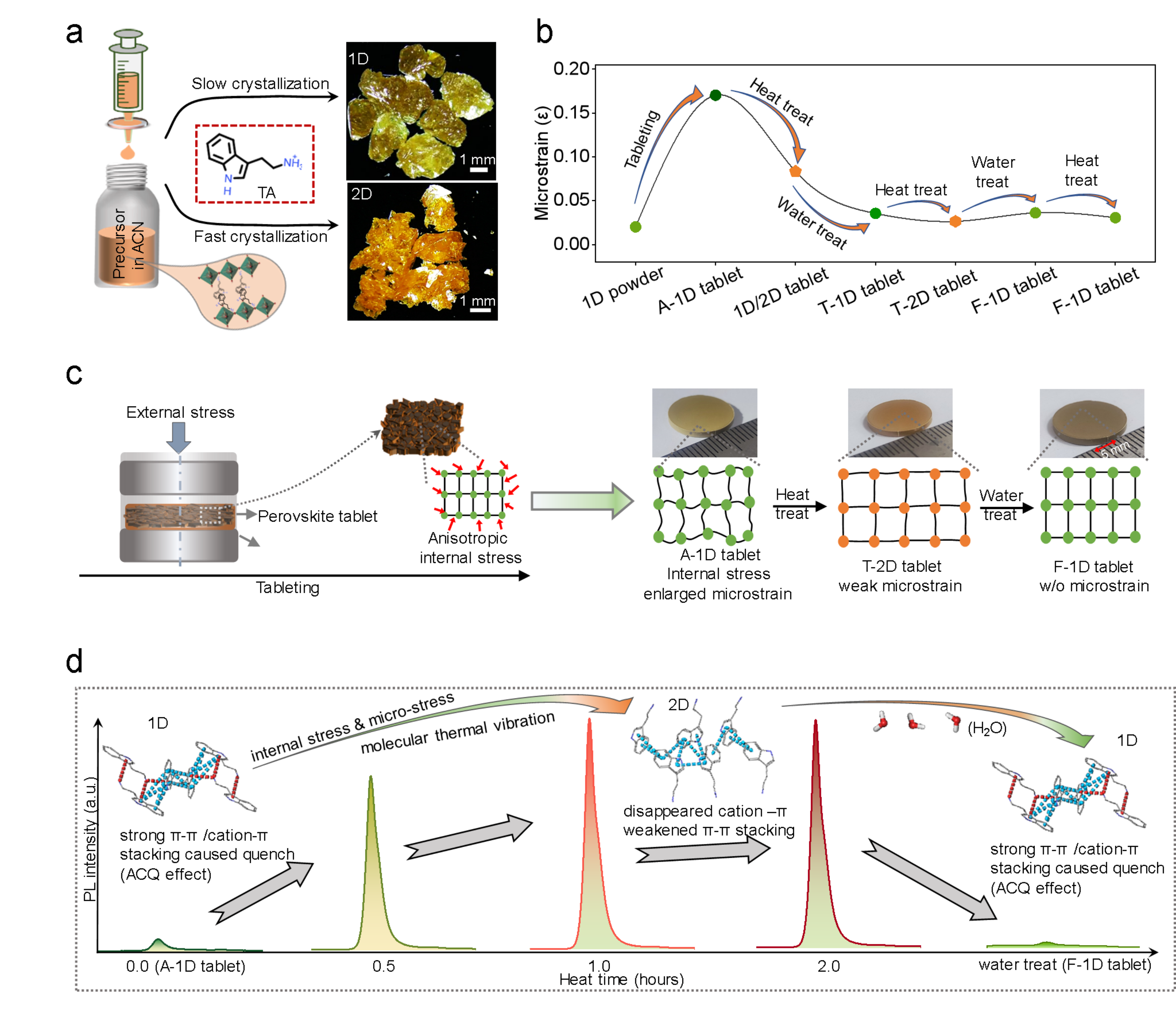 图1.a,调控结晶动力学得到两种维度钙钛矿晶体。b,维度转变期间的微应力释放过程。c,压片及水/热驱动维度转变示意图。d,维度转变过程中的分子构象变化及对应的荧光变化。