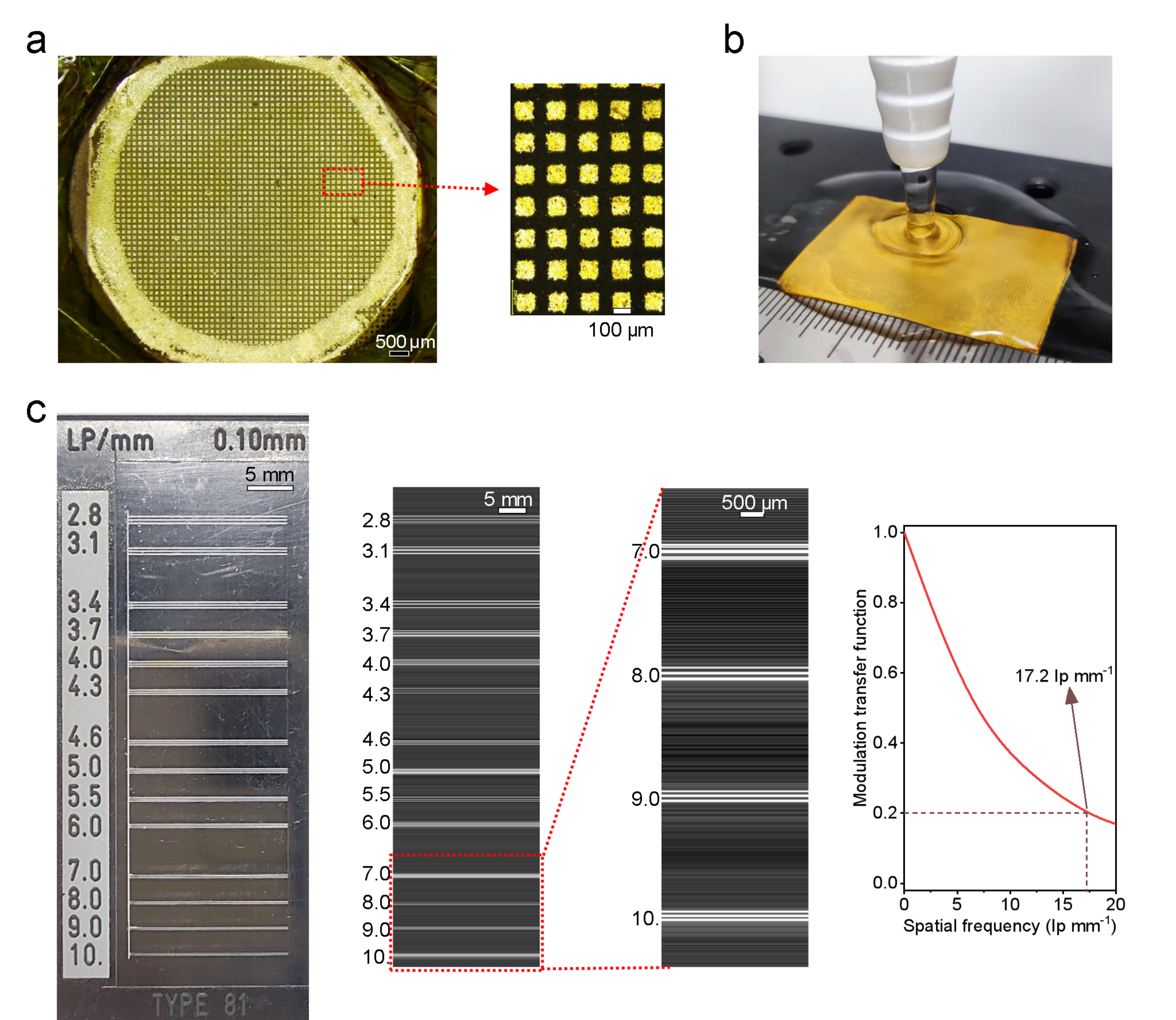 图3.a,钙钛矿表面光刻得到的阵列化电极图案。b,色胺基钙钛矿材料抗流水冲洗不分解。c,射线成像及高达17.2 lp/mm的成像分辨率。