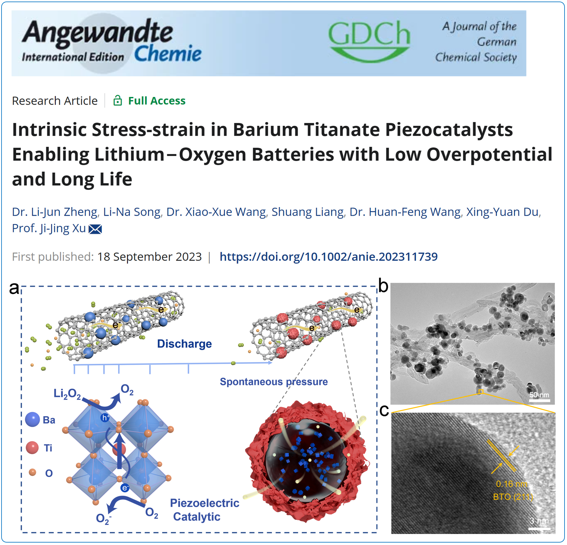 论文详情:Li-Jun Zheng, Li-Na Song, Xiao-Xue Wang, Shuang Liang, Huan-Feng Wang, Xing-Yuan Du, and Ji-Jing Xu*, Intrinsic Stress-strain in Barium Titanate Piezocatalysts Enabling Lithium−Oxygen Batteries with Low Overpotential and Long Life,Angew. Chem. Int. Ed., 2023, 62, e202311739.
