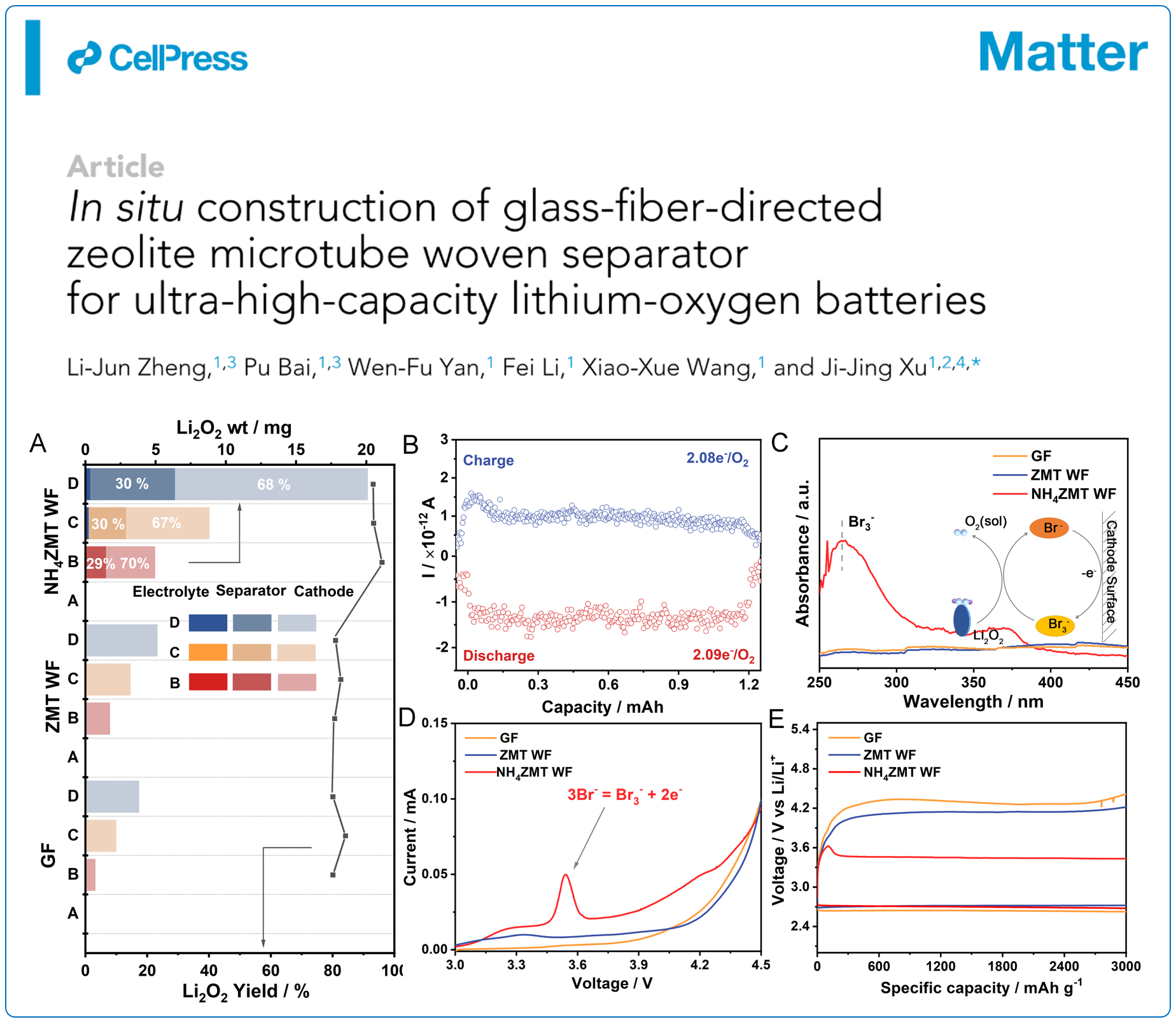 论文详情:Li-Jun Zheng, Pu Bai, Wen-Fu Yan, Fei Li, Xiao-Xue Wang, and Ji-Jing Xu*, In situ construction of glass-fiber-directed zeolite microtube woven separator for ultra-high-capacity lithium-oxygen batteries,Matter, 2023, 6, 142–157.