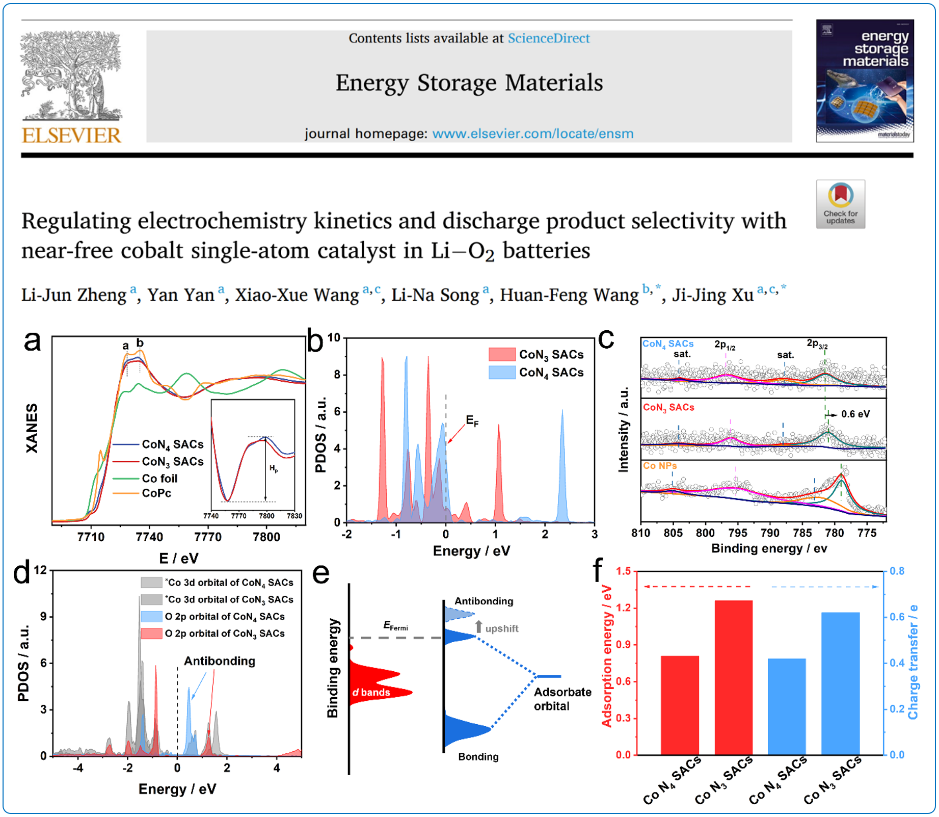 论文详情:Li-Jun Zheng, Yan Yan, Xiao-Xue Wang, Li-Na Song, Huan-Feng Wang* and Ji-Jing Xu*, Regulating electrochemistry kinetics and discharge product selectivity with near-free cobalt single-atom catalyst in Li−O2batteries,Energy Storage Mater., 2023, 56, 331–341.