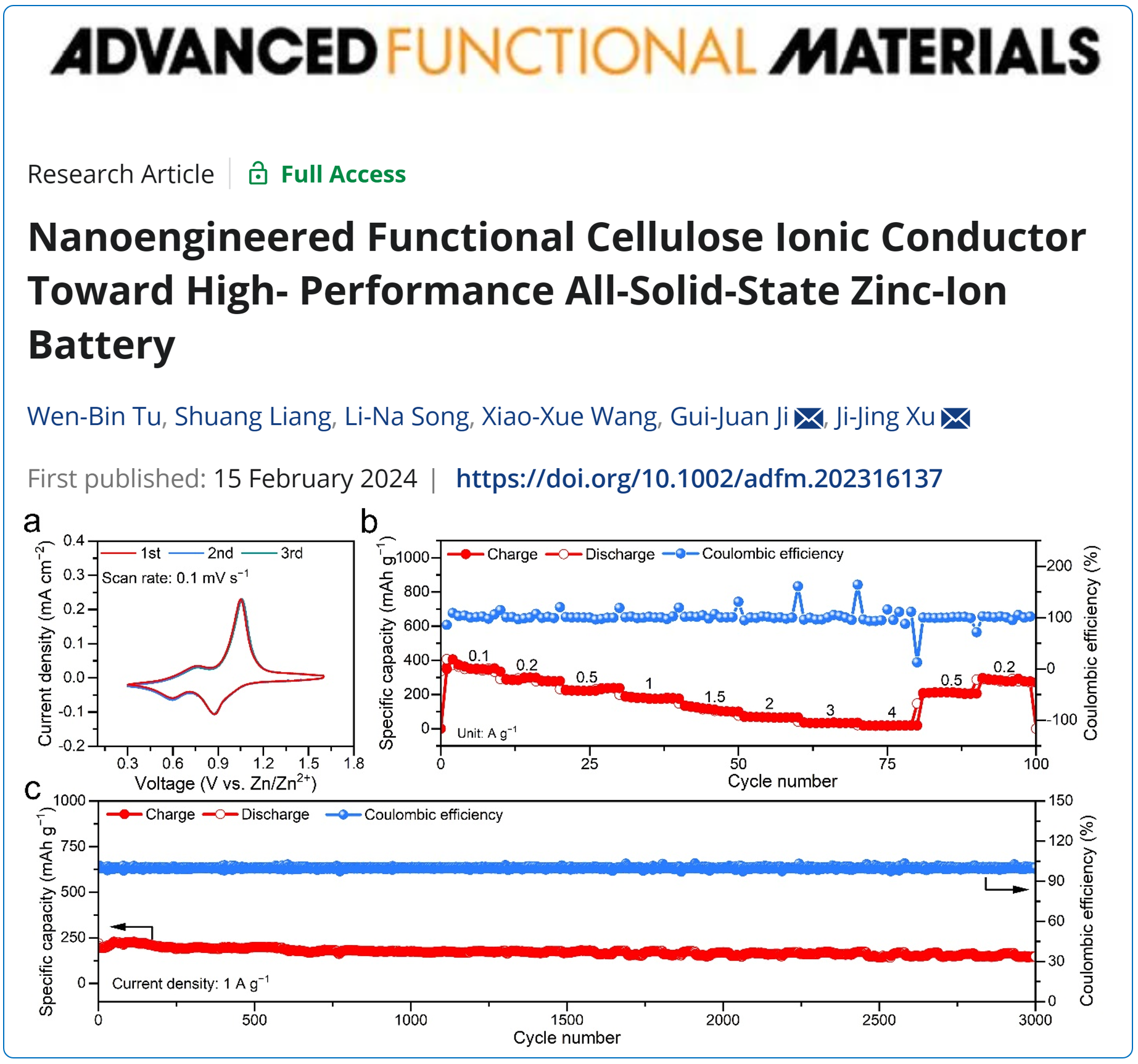 论文详情:Wen-Bin Tu, Shuang Liang, Li-Na Song, Xiao-Xue Wang, Gui-Juan Ji*, and Ji-Jing Xu*, Nanoengineered Functional Cellulose Ionic Conductor Toward High-Performance All-Solid-State Zinc-Ion Battery,Adv. Funct. Mater., 2024, 2316137.
