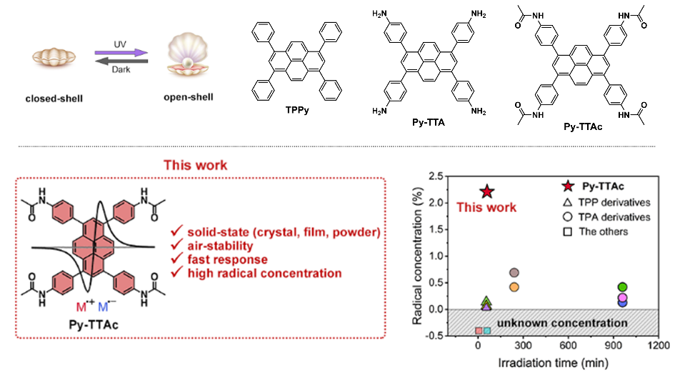 李峰教授和张明教授团队以四苯基芘为研究对象,合成了一类基于平面共轭结构的对称芘衍生物,实现了固态下的快速光响应,并产生了光诱导的稳定自由基。其中,Py-TTAc的光生自由基离子对能够在空气中稳定存在超过12小时,最大自由基浓度可以达到2.21%。