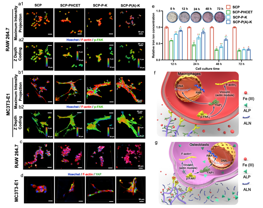 图2. 智能超分子修饰植入物表面对成骨细胞和巨噬细胞的机械效应