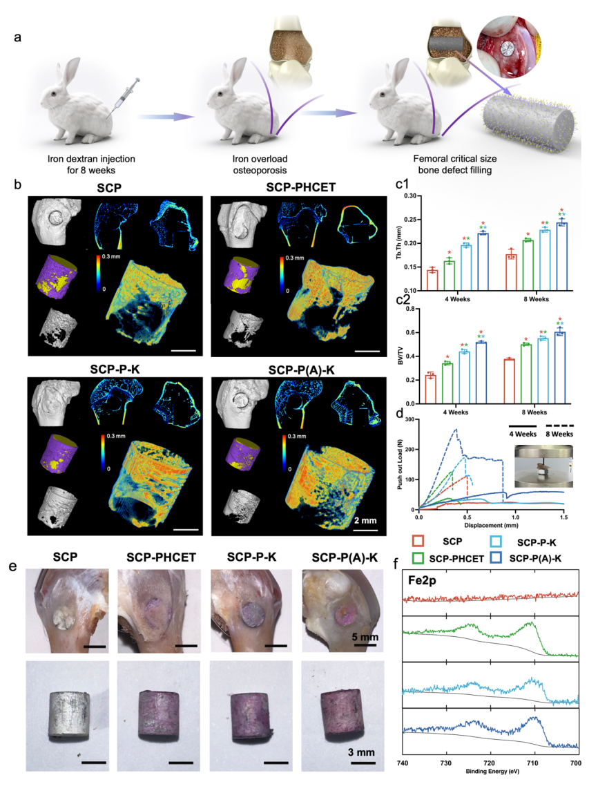 体外实验在铁过载培养基中进行,证明智能超分子表面具有高度智能的内源性响应能力,且成功实现抑制巨噬细胞黏附、促进成骨细胞分化的效果;为验证该智能超分子表面的体内骨修复能力,构建了铁过载引起的骨质疏松大耳白兔股骨缺损模型,将修饰后的植入材料植入缺损部位,对术后4周和8周的动物进行成骨效果评价,证实了植入物表面内源性调节的成功发生,并有效提升了新骨生成质量,修饰后的植入物周围骨小梁厚度(Tb.Th)和骨体积分数(BV/TV)均有明显提升。