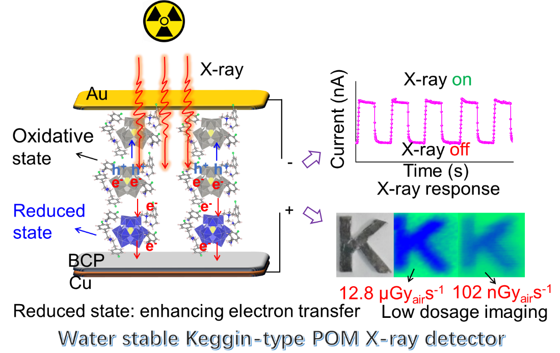 多金属氧酸盐,俗称:多酸(POMs),是由一类由高氧化态的前过渡金属元素 M(如 WVI,MoVI,TaV,VV,NbV等)通过氧桥连接而形成纳米或微米级的金属-氧簇类化合物,其结构特点主要是以氧为顶点的[MO6]八面体和[MO4]四面体通过共角、共边或者共面的形式连接而成。近年来,多酸在半导体材料领域崭露头角,如在钙钛矿和有机太阳能电池中,多酸作为电子传输层或空穴传输层能够有效提高其光电转换效率。尽管POMs表现出优异的半导体性能,但将其用作X射线探测器的活性层直接进行X射线探测和X射线成像尚未被探索。当然,POMs作为直接型X射线探测器可能具有以下独特的优势:首先,所构建的POMs探测器中的许多重金属(如W)可以大大提高对X射线阻挡能力,从而促进对X射线的有效吸收。此外,POMs的“电子海绵”特性能够保证POMs在获得或失去电子时保持结构完整性,这可以有效地促进光生载流子的分离。更重要的是,POMs优异的水稳定性确保了器件可以长期有效运行。因此,设计一种用于X射线探测和成像的POMs器件有利于扩大POMs在半导体领域的应用,进一步加深对POMs半导体特性的理解。