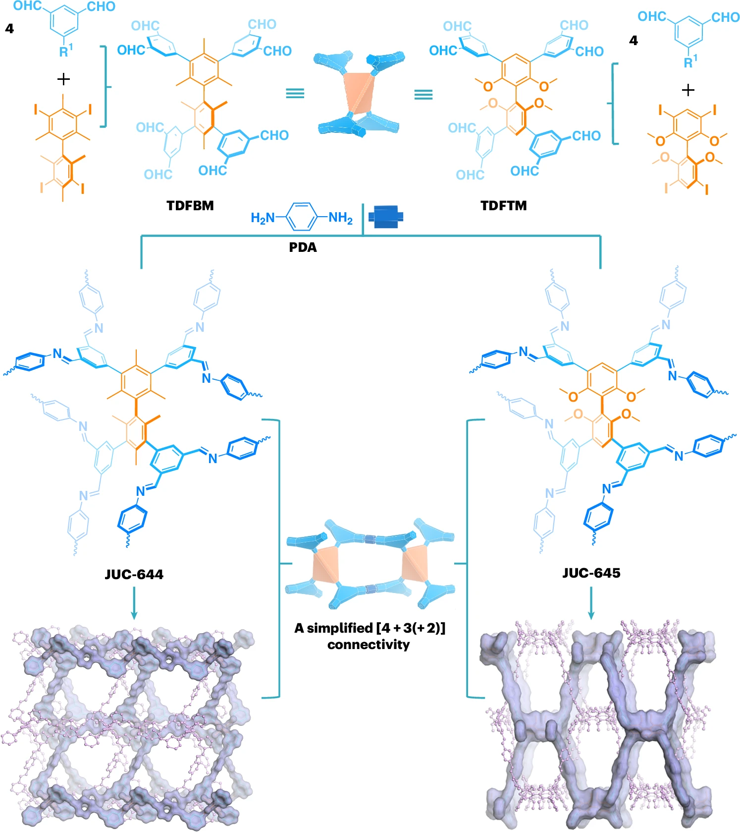 与已有的构建单元相比,所设计的构建单元在点群对称性上存在显著差异,且多数表现为降低的对称性。作为该策略的初步实现,研究团队将四个3连接的三角形外部亚单元(C₂v对称性)与一个4连接的三维扭曲四面体中央亚单元(D₂d对称性)进行组合,生成了具有D₂d对称性且构型灵活性较高的非传统8连接(8-c)构建单元(图2)。值得注意的是,由于最稳定构象的差异及二面角变化的灵活性,由这些D₂d构建单元形成的拓扑结构具有不可预测性,且在以往文献中尚未见报道。这些独特的8-c构建单元分别与对苯二胺(PDA,图2所示)作为线性连接单元发生缩合反应,成功构筑了两种新型3D COF材料JUC-644和JUC-645,呈现出独特的结构特征和拓扑网络。