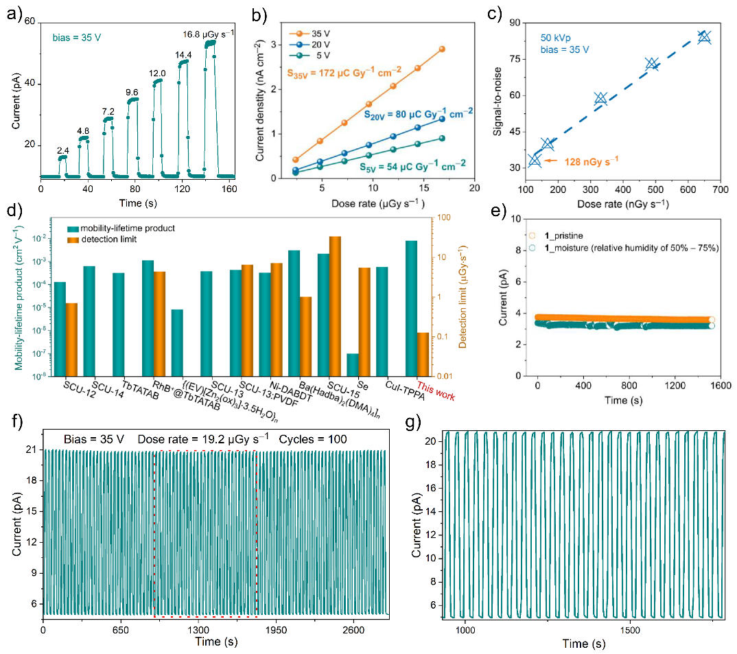 器件通过双探针方法在真空环境下进行测试,结果表明其在X射线探测中具有优异表现(图三)。化合物1具有较大的体电阻和较低的读出噪声,同时展现出优异的电荷收集效率和稳定性。化合物1在X射线探测中的性能通过光电灵敏度(S)和检测限(LoD)进行了评估(图四)。S值反映了材料将光信号转换为电信号的能力,测试表明1的光电流强度随着X射线剂量率的增加呈线性增长。在5至35 V的偏压下,S值从54增加到172 µC Gyair⁻¹cm⁻²,大大优于商用α-Se(20 µC Gyair⁻¹cm⁻²),展示了其优秀的光电转换能力。此外,1具有最低检测限,低于所有已报道的CP基探测器。化合物1的低噪声特性归功于高体电阻率、杂原子配体的引入和连接体电子态的调节,这显著降低了热噪声和1/f噪声。此外,1具有良好的稳定性,在50%–70%相对湿度下三个月内性能无显著变化,并在85%–100%高湿度下24小时后保持晶体结构稳定。在多次循环和长时间辐照(>2000秒)下,其光电流增益稳定,信号漂移小,表明其是高性能X射线直接探测的有利候选材料。