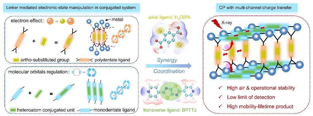 X射线成像广泛应用于医学诊断和工业无损检测,直接探测器因无需光信号的二次转换,具有更高空间分辨率和简化系统制造的优势。然而,传统非晶α-Se探测器因其低X射线吸收能力、稳定性不足、检测灵敏度较低限制了其应用。杂化钙钛矿基半导体因优异的光电性能受到关注,但其离子迁移和稳定性差的问题尚未解决。在本研究中,通过调控连接体介导的电子态构筑多通道电荷转移的共轭CP。基于双配体方法进行横向和纵向的电子密度精确调控,一方面是有利于提高结构稳定性,一方面是有利于分区域双向调控(图一)。在横向,通过引入杂原子刚性共轭基团调节配体的前线分子轨道的离域程度,增强分子轨道空间上的重叠,杂原子的引入同时也增强了分子间的非键相互作用力。在纵向,通过引入线性刚性多齿配体,由于电子效应调控金属键合功能化基团的酸性,提高面内和面外的结晶度,使得多齿配体在纵向形成聚集体密堆积。构筑后的框架结构,轨道在空间上的重叠,形成多通道电子转移输运途径,有利于电荷的分离和运输。
