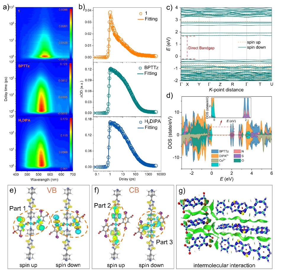 基于上述策略,该工作合成了化合物1,{[Co(BPTTz)(DIPA)]·DMA}n。为了验证化合物1的电荷迁移行为,对1、BPTTz和H2DIPA的飞秒瞬态吸收(fs-TA)光谱进行对比分析,探讨其电荷分离过程(图二)。通过多指数拟合动力学曲线发现,与纯配体相比,1的衰减更快,表明其发生了快速电荷转移。密度泛函理论(DFT)计算显示,1为直接带隙结构,更有利于X射线吸收。同时,DIPA²⁻和BPTTz之间存在配体内及配体间的多重分子间相互作用。这种紧凑的分子结构和强的分子间作用显著提高了载流子的分离和传输效率,有效减少了载流子复合和猝灭损失,使得化合物1拥有更长的弛豫寿命和更高的迁移率-寿命乘积,这为高效多通道传输提供了可能。