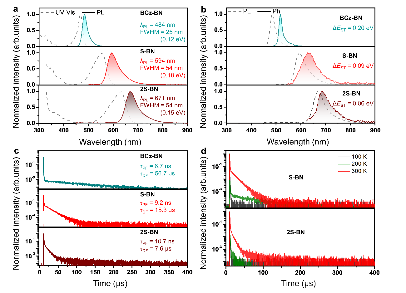 图2:BCz-BN、S-BN和2S-BN的光物理性质。a在300 K下甲苯中的紫外-可见吸收和荧光光谱。b在300 K下的荧光和77 K下的磷光光谱。c在氮气吹泡10分钟后甲苯中的瞬态荧光衰减曲线。d在不同温度下的瞬态荧光衰减曲线。